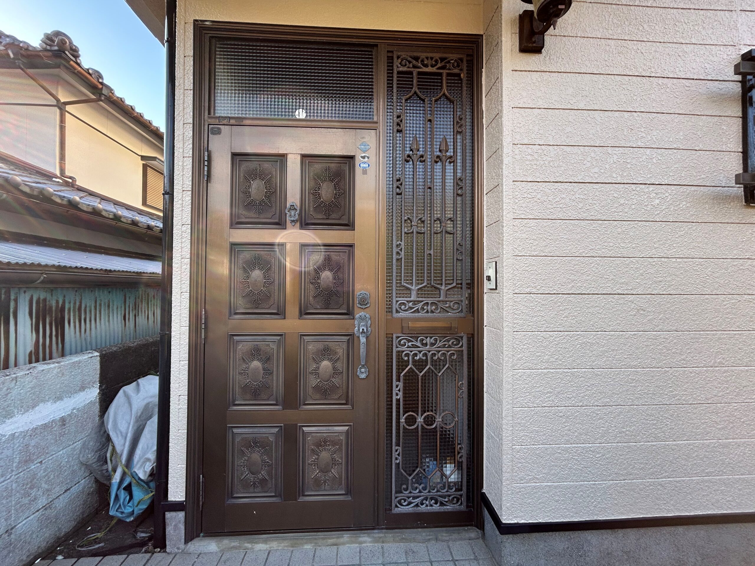 今回は既存玄関ドアが古く修理不可であったのでカバー工法を採用致しました。既存玄関ドアの枠以外を撤去し、既存枠の上からカバー工法することにより外壁を改修することなく施工可能なのでコストも抑える事ができます。