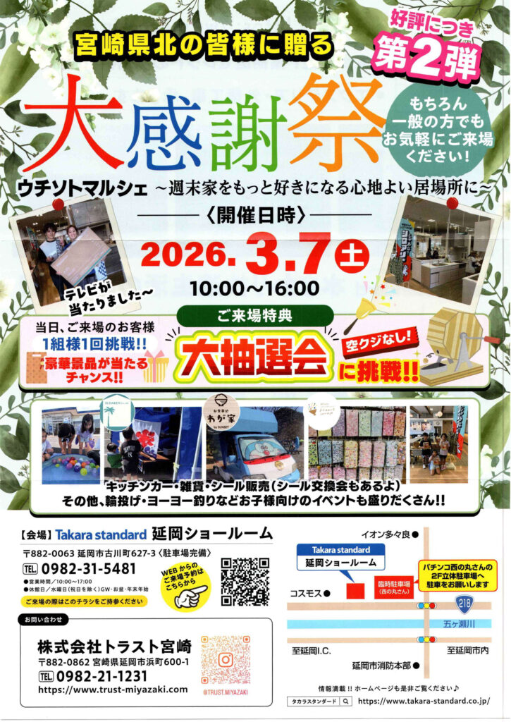 2026年3月7日(土)大感謝祭のお知らせ 投稿日 2026年2月18日 著者 iwamoto カテゴリー お知らせ 2026年3月7日(土)に延岡市古川町のタカラスタンダード延岡ショールームにて、大感謝祭が行われます。 キッチンカーや雑貨・シール販売・お子様向けイベントも盛りだくさんあります。 ご来場希望の方がおられましたらチラシを郵送致しますのでお知らせください。 お客様がいらっしゃる時間が分かれば自分もお伺い致しますのでご応募お待ちしております。